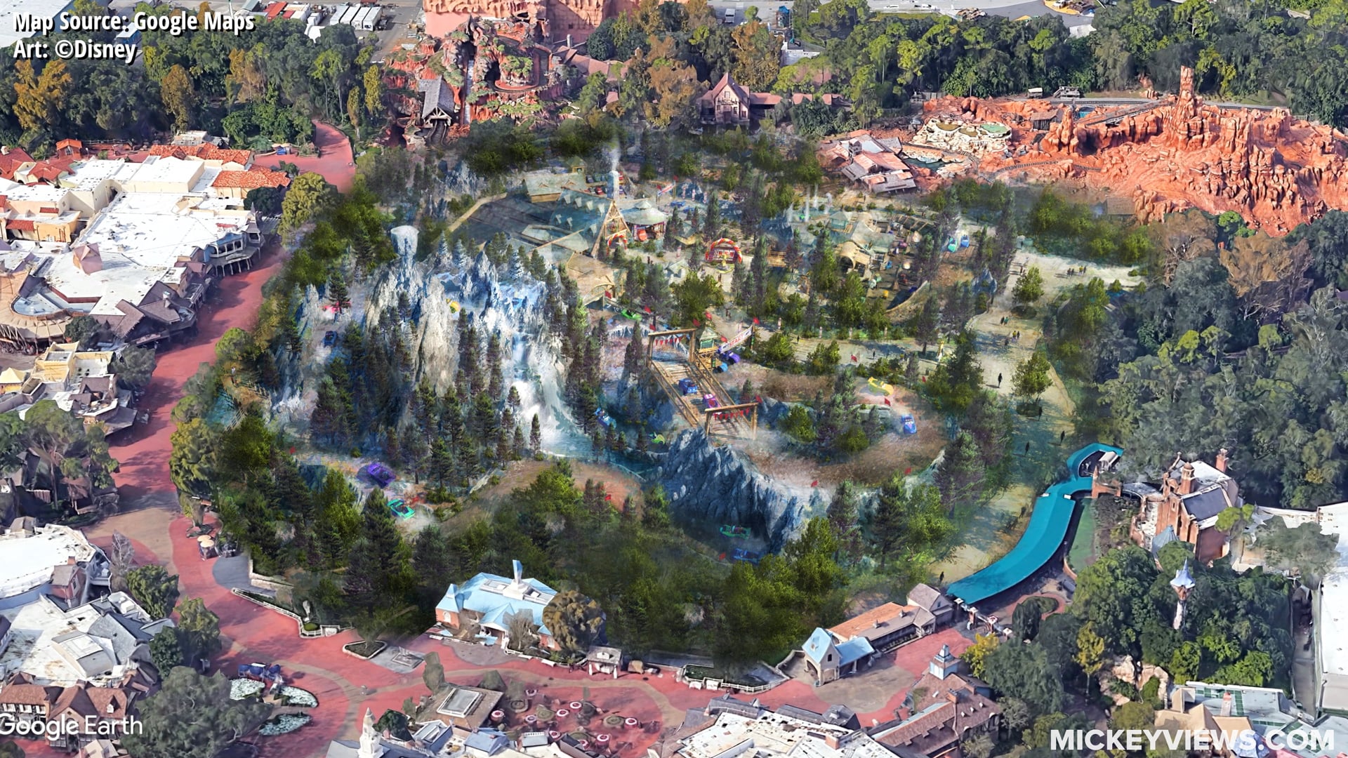 Image composite of Disney’s concept art for the Cars-themed Piston Peak National Park coming to Magic Kingdom. (Aerial: Google Maps, Art: ©Disney)