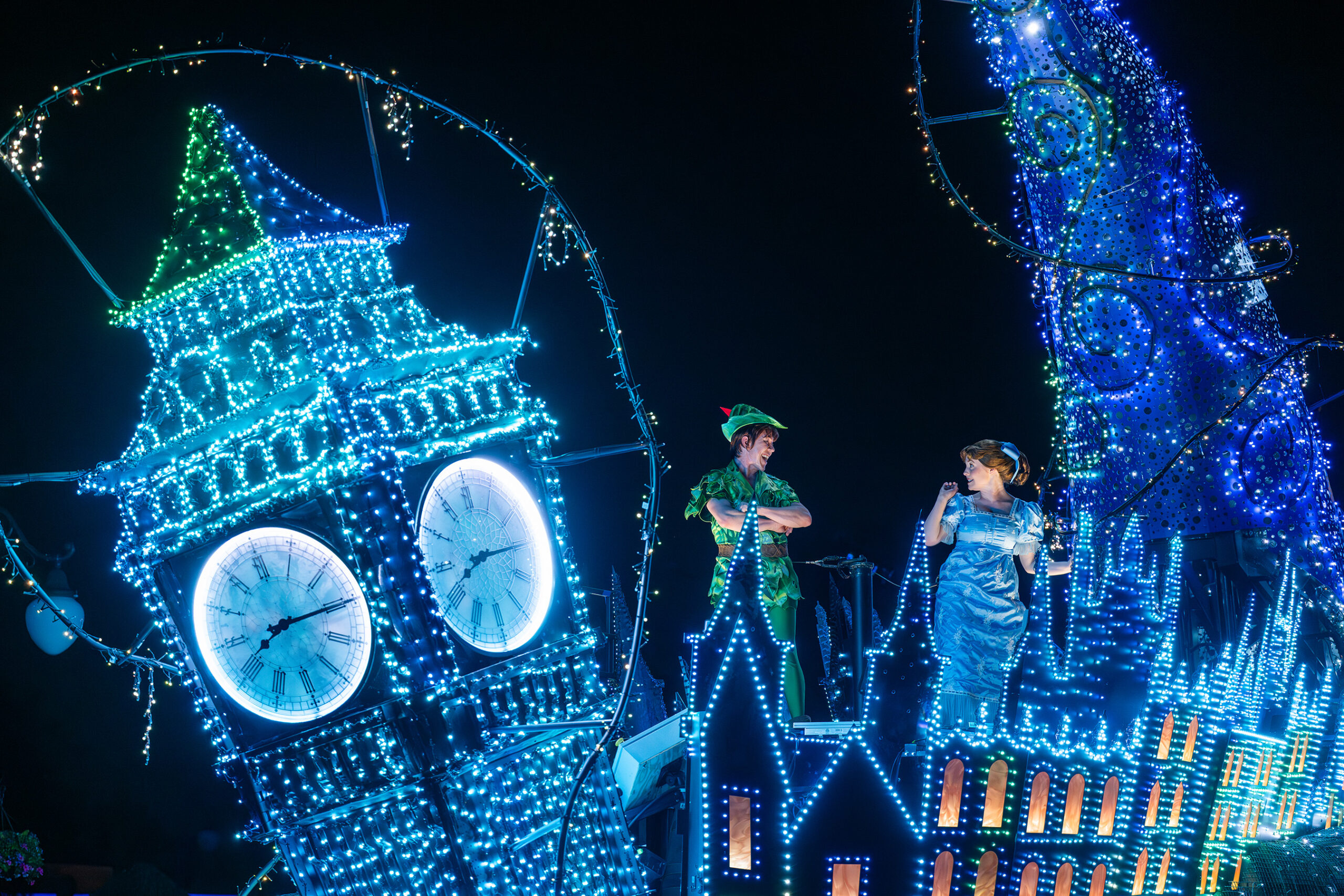 Peter Pan and Wendy on the penultimate float during the “Disney Starlight: Dream the Night Away” nighttime parade. (©Disney)