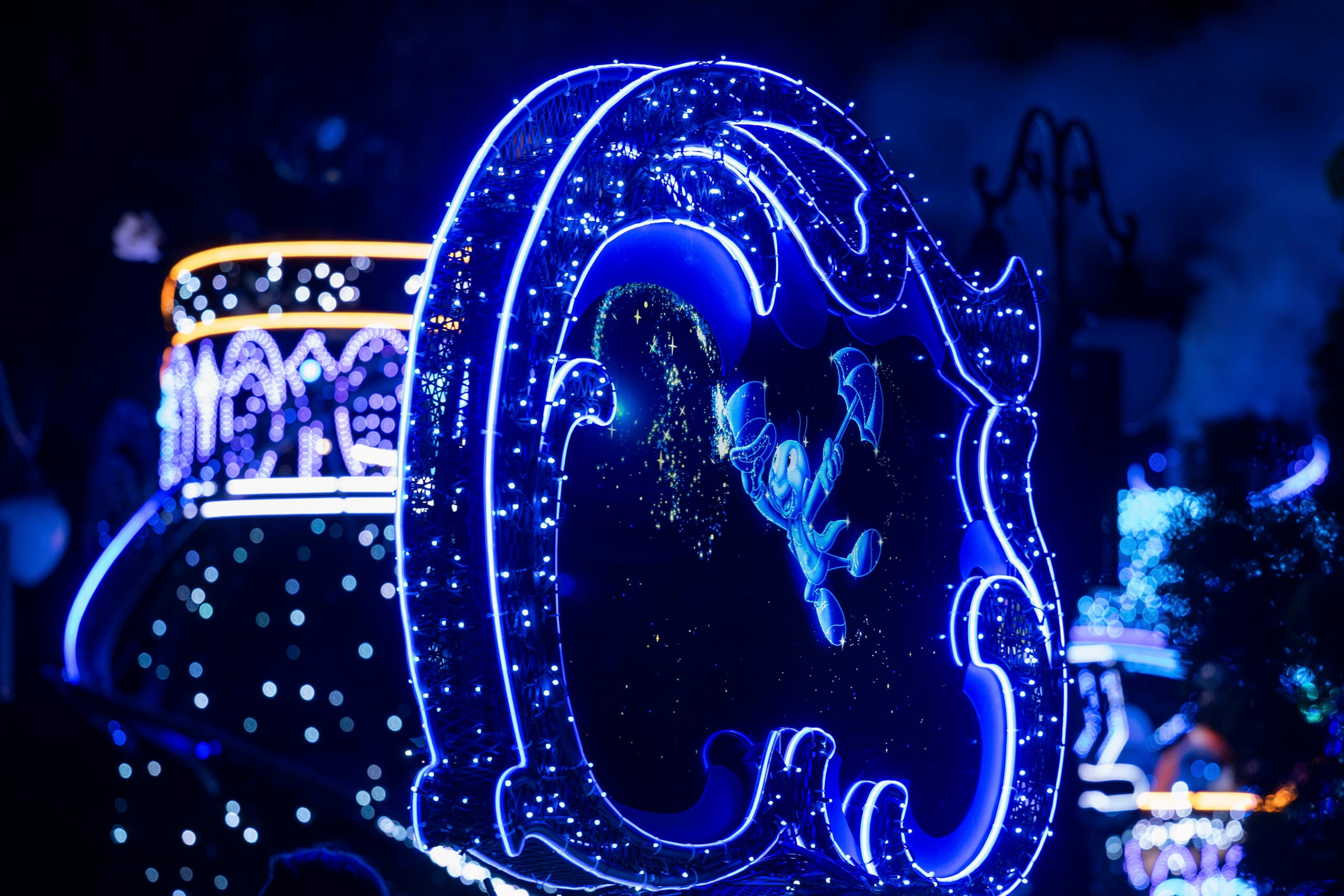 A hand-drawn and digitally animated Jiminy Cricket debuts farewell to guests on the back of the final float during the “Disney Starlight: Dream the Night Away” nighttime parade. (©Disney)