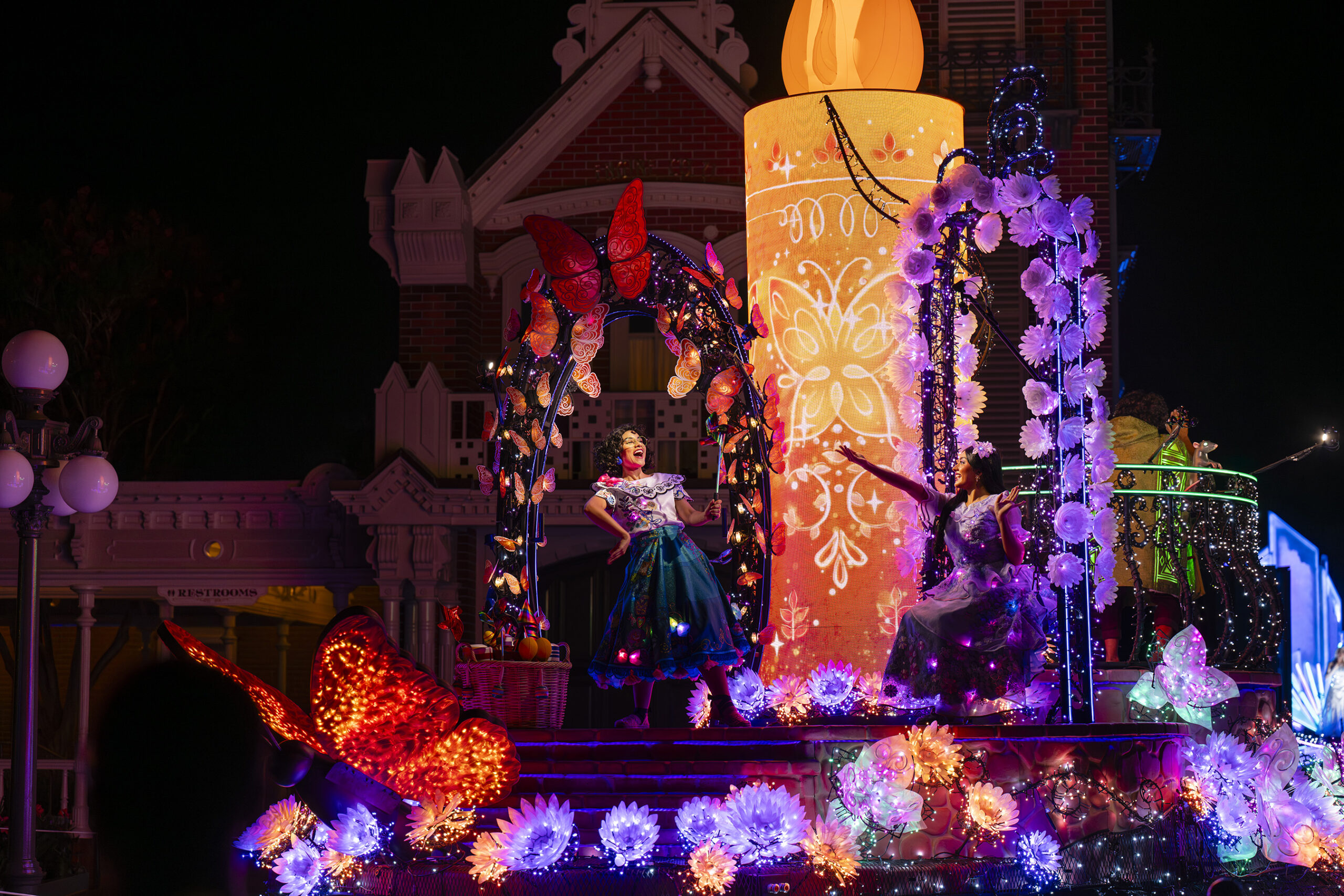 Following an in-between sequence of walking streetmosphere dancers holding LED butterflies, the Encanto float arrives. Encanto’s float features a large candle, many illuminated flowers as well as butterflies. Isabela & Mirabel wave at guests and dance!
