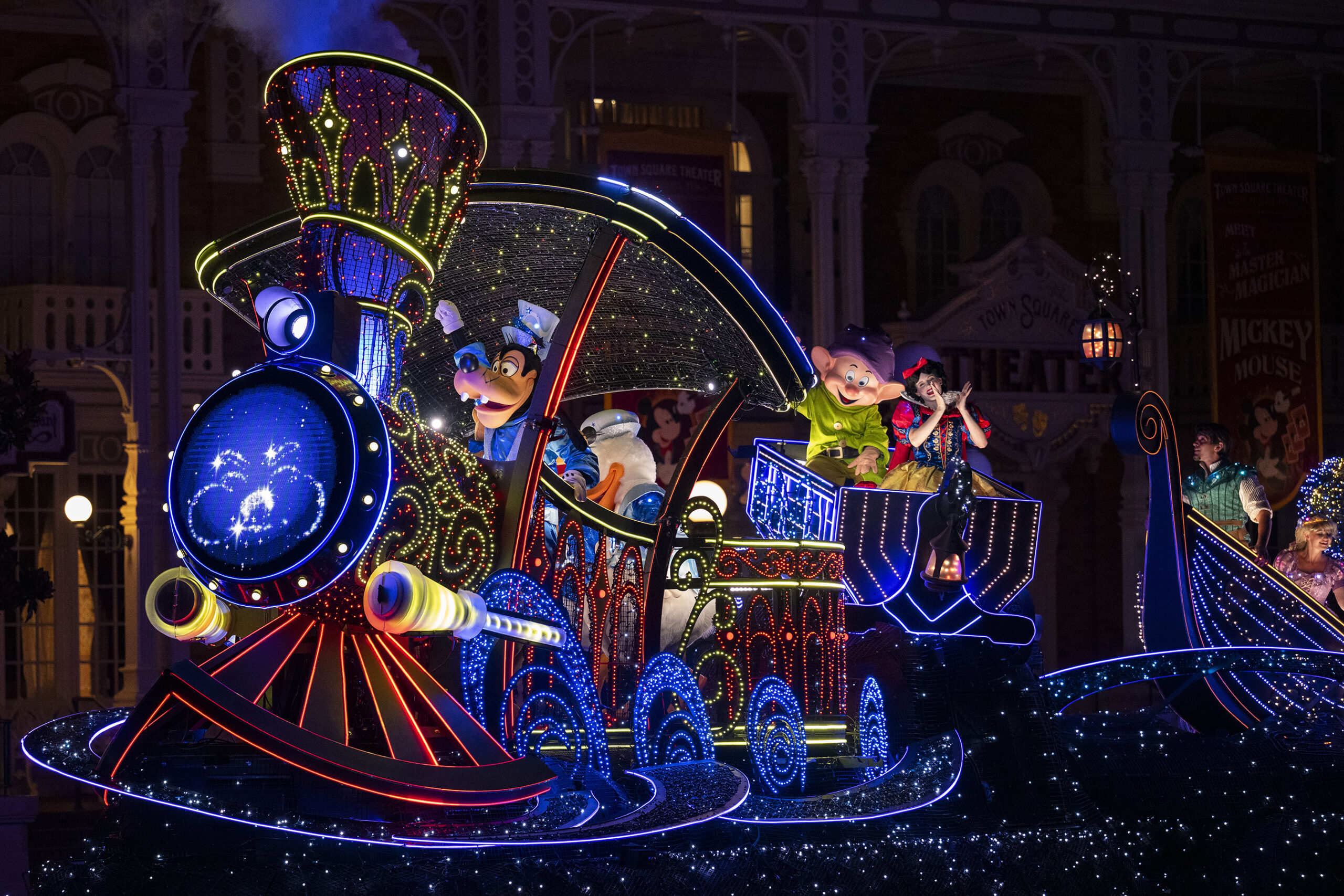 Aboard “Whimsy” are Goofy and Donald. Behind the Locomotive are Snow White and Dopey the Dwarf on an illuminated Mine Train Car. Next, Rapunzel and Flynn Rider sail by in their boat. Then, Aladdin and Jasmine float by on a Magic Carpet! Leading up the rear of this massive finale float are Mickey and Minnie Mouse waving at guests!
