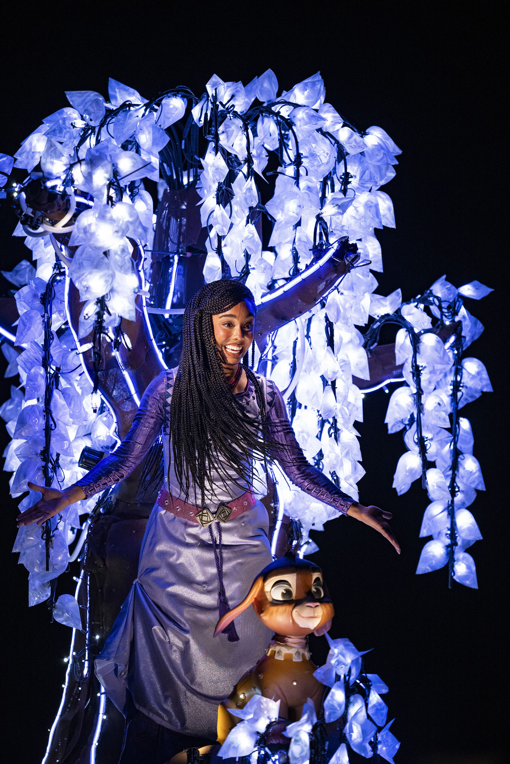Next up is a smaller tree-shaped float featuring Asha and Valentino the Goat from Walt Disney Animation Studios’ 2023 animated film Wish.