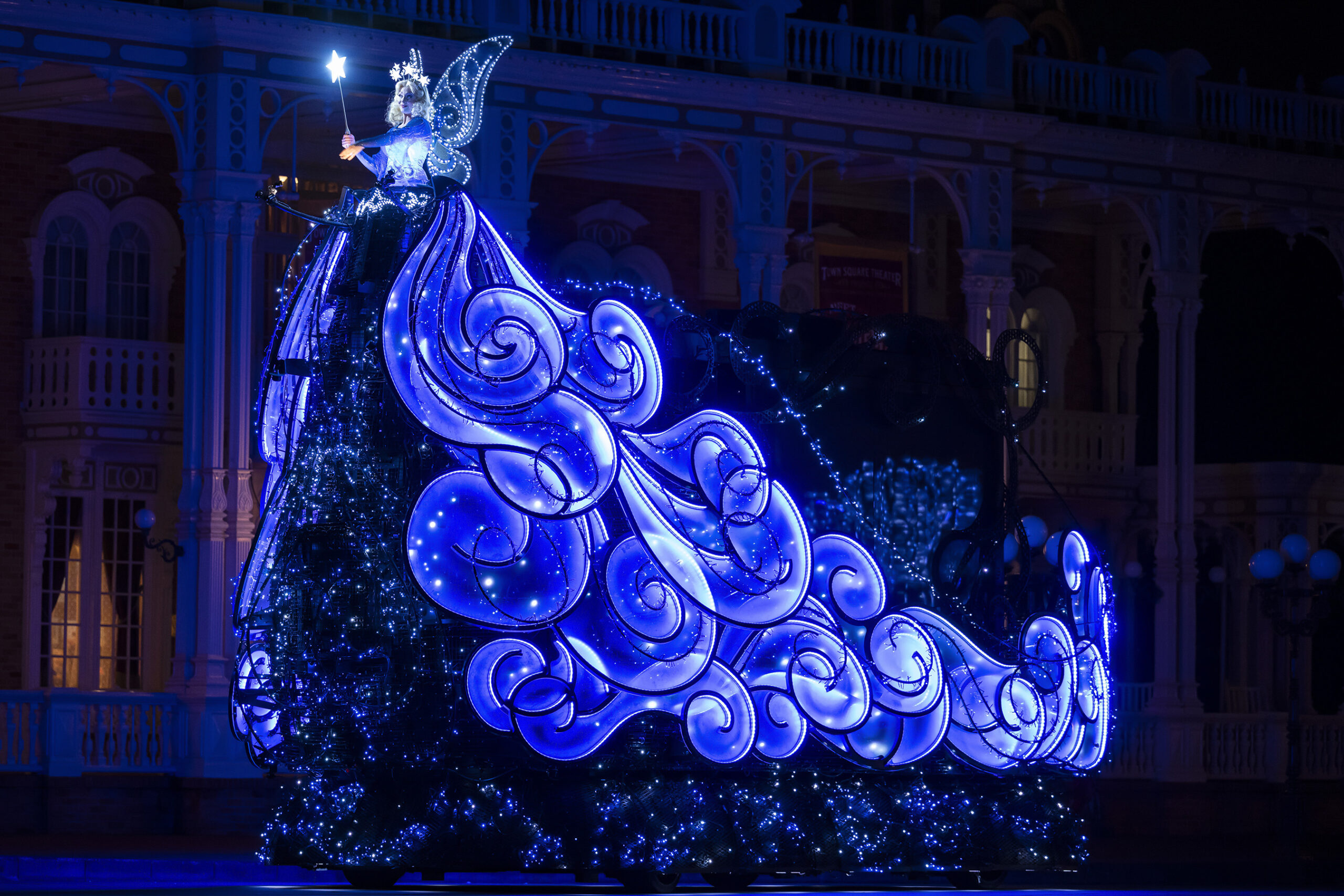 After the lights dim along the parade route and a musical tribute to the Main Street Electrical Parade echoes through the park, the first float of Disney Starlight makes its appearance. The “Blue Fairy” opening float features the Blue Fairy atop a flowing form of synchronous nighttime parade lights.