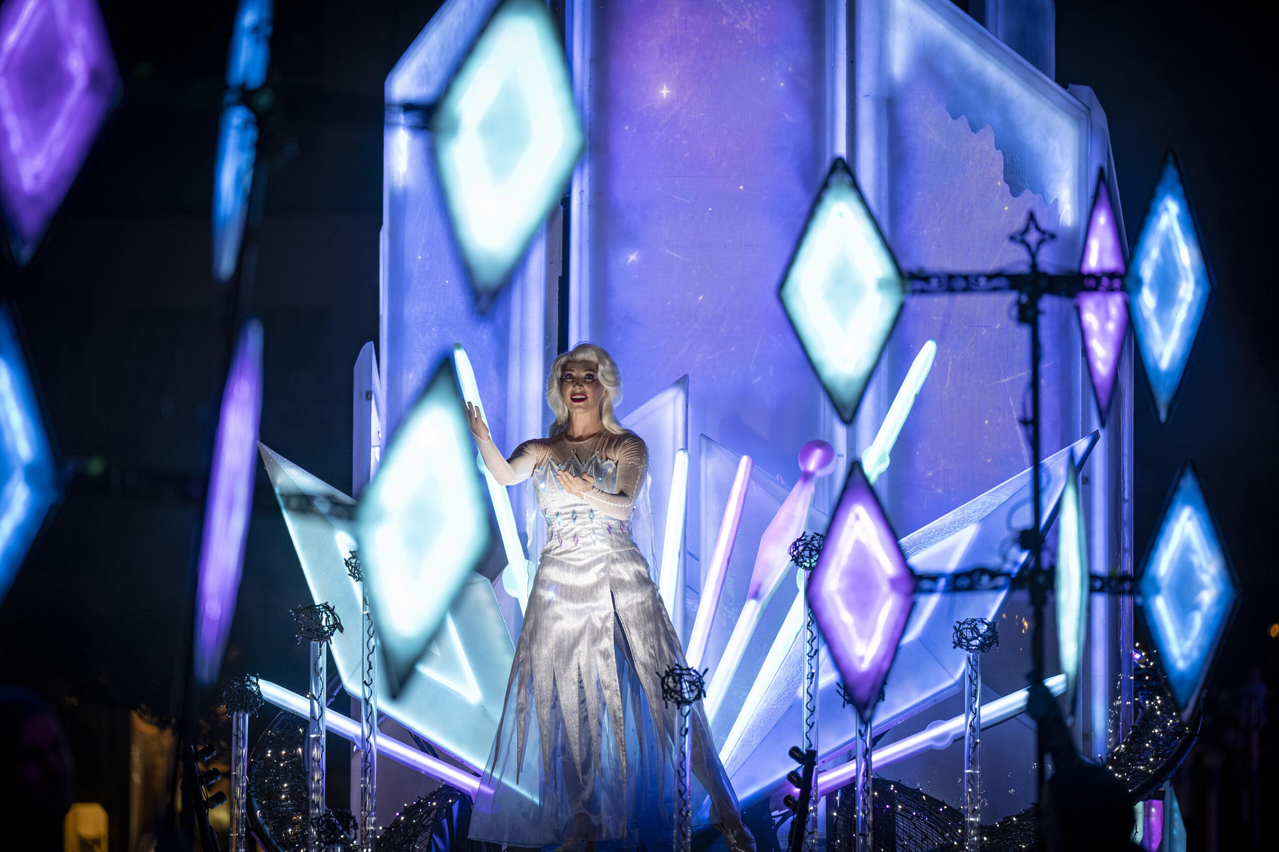 Elsa then arrives on her float, themed to and playing audio from the Frozen sequel, Frozen II.
