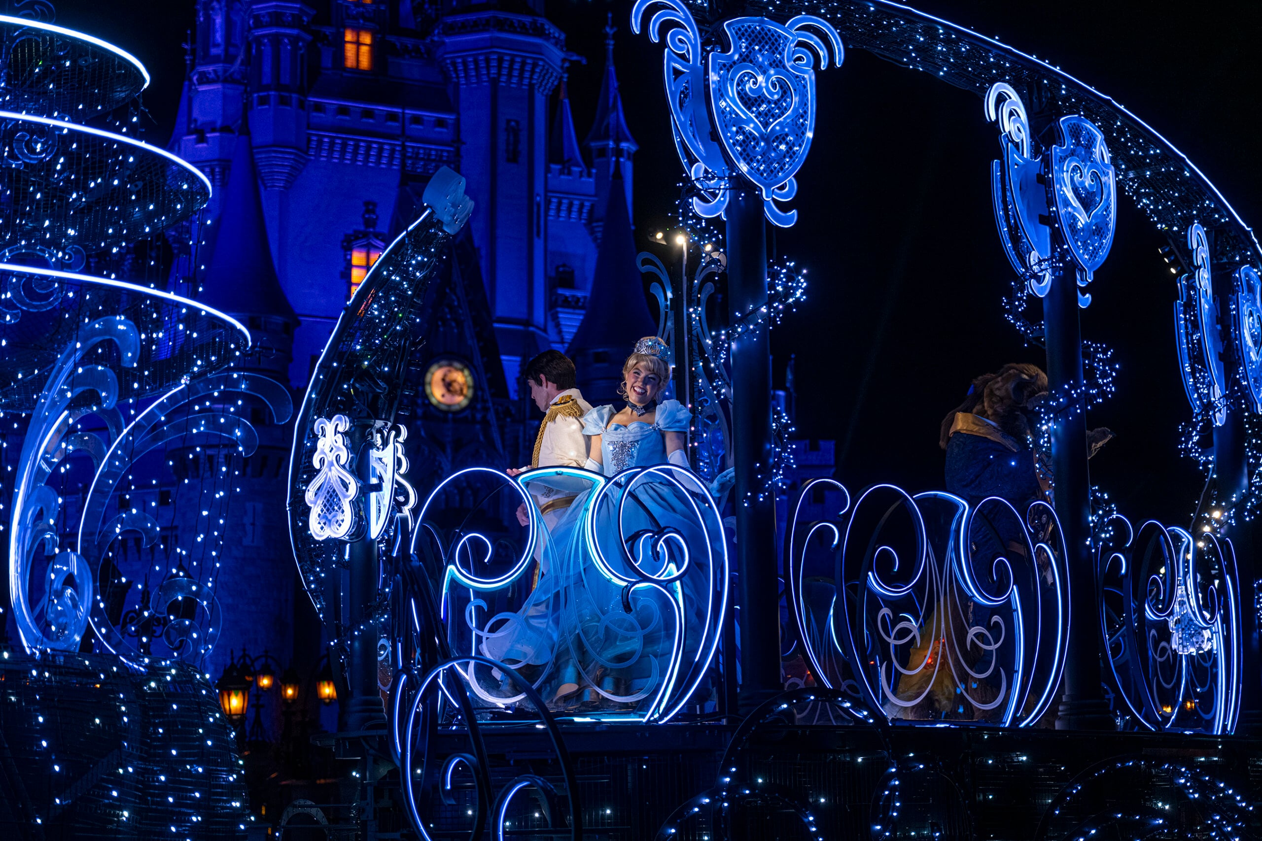 Cinderella and Prince Charming aboard the Royal Princess Float during the “Disney Starlight: Dream the Night Away” nighttime parade. (©Disney)