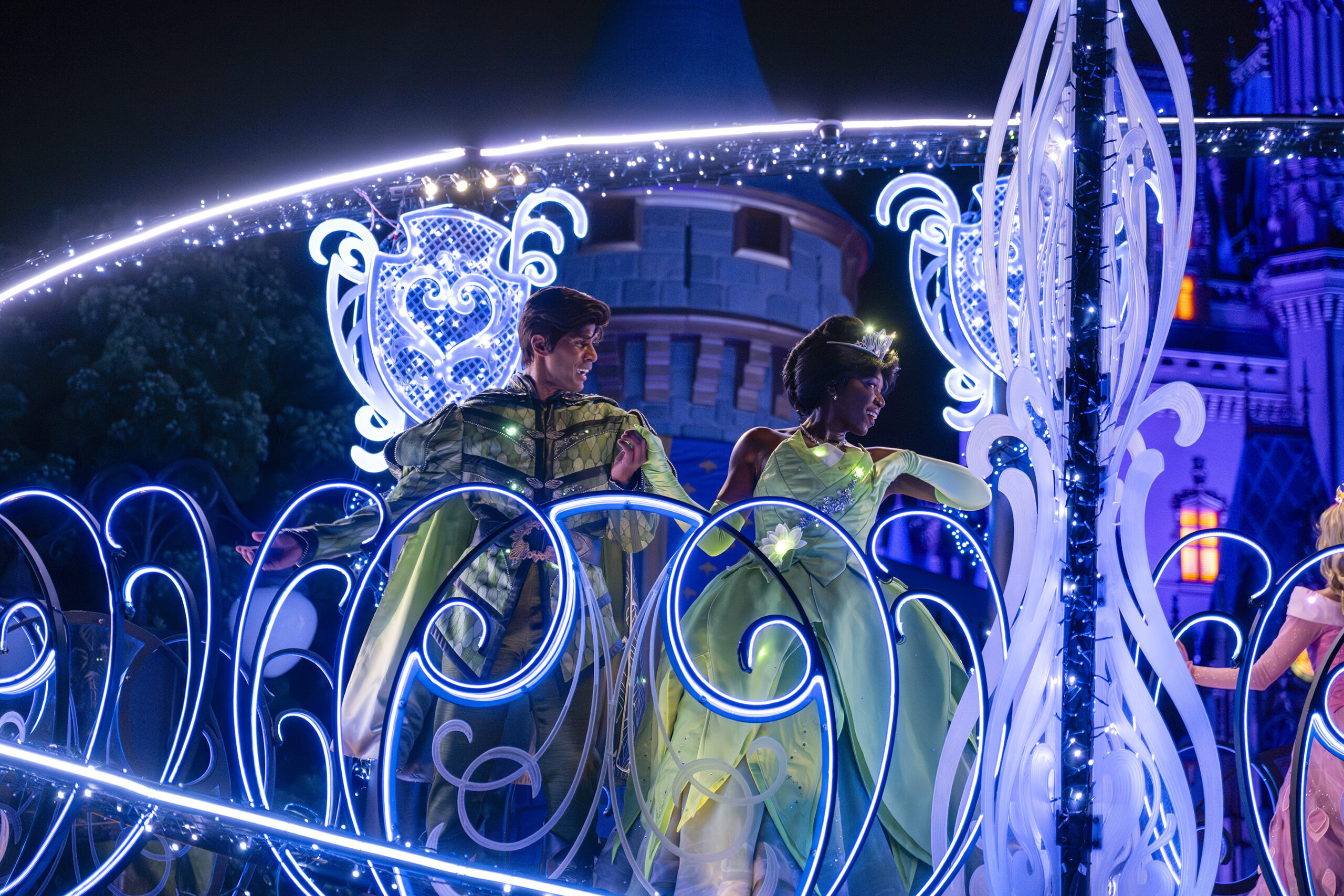 Tiana and Prince Naveen on the Royal Princess Float during the “Disney Starlight: Dream the Night Away” nighttime parade. (©Disney)