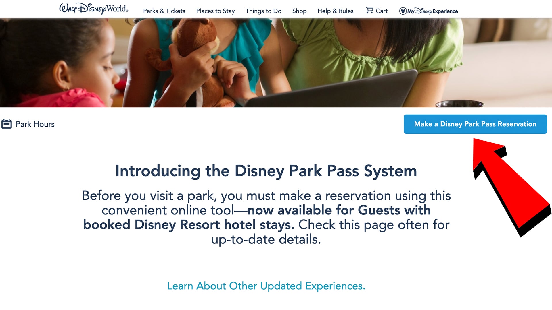 - Go to https://disneyworld.disney.go.com/experience-updates/park-reservations/ and click the blue button that says “Make a Disney Park Pass Reservation.” Here you will be met with the already infamous pink castle waiting screen. We suggest going and get some food at this point, whenever the page finally comes up it’ll be waiting for you.