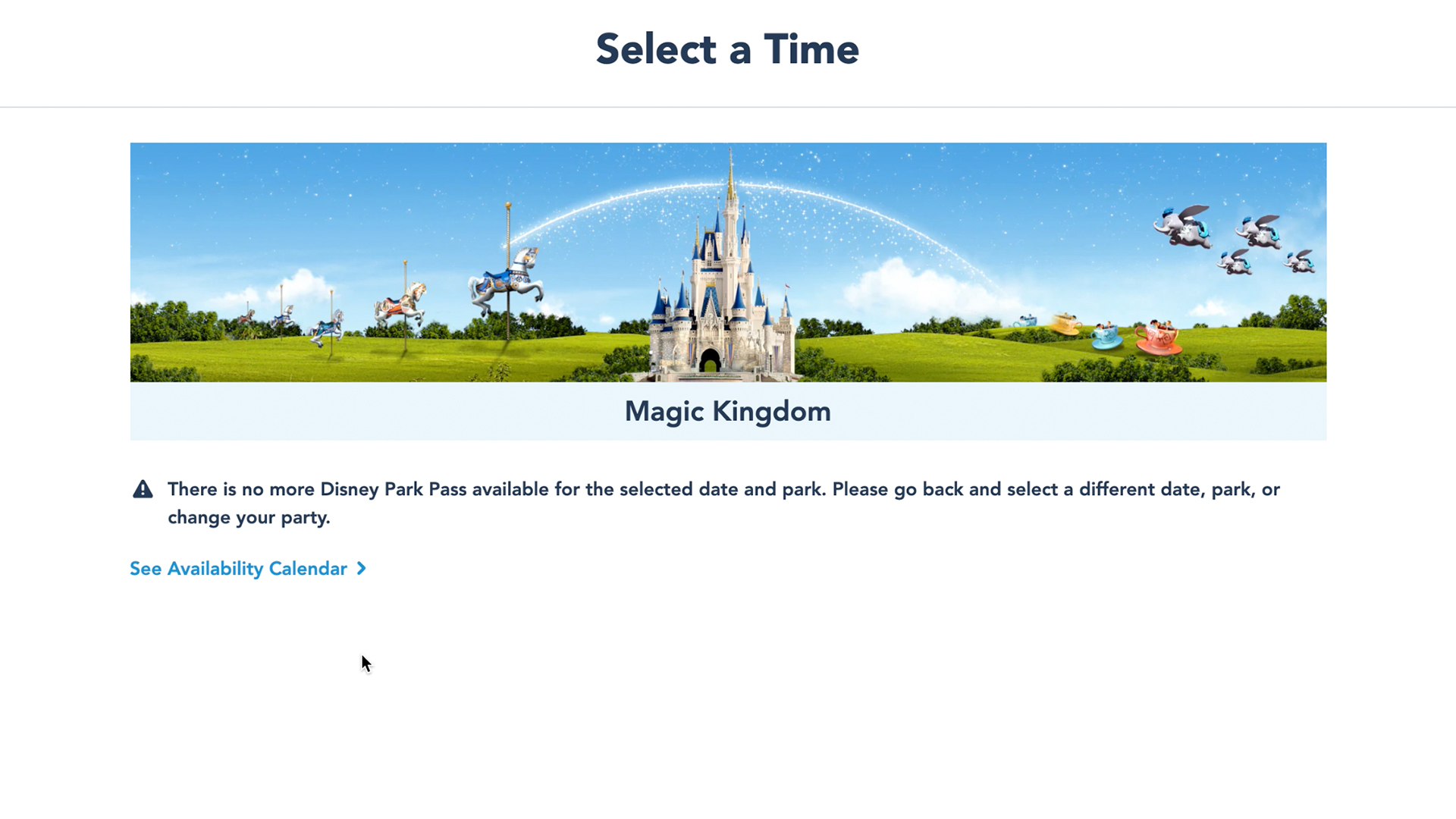 If you get an error that says “there is no more Disney Park Pass available for the selected date and park” it could mean one of a couple things. It either means the park is truly booked up (which you can verify via the availability calendar we mentioned earlier) OR that the system has an issue with the tickets of the connected guests. Annual Passholders who sign in and get to this page get this message (since they can’t use the system till June 26th). Even some DVC members with proper admission have reported getting this empty calendar as well. Errors like these and any arbitrary limits you recieve on how many reservations you can make during your hotel stay are things Disney should be working to iron out as we speak. (Also, make sure you’re checking the proper days where you have a hotel stay linked to your account.)