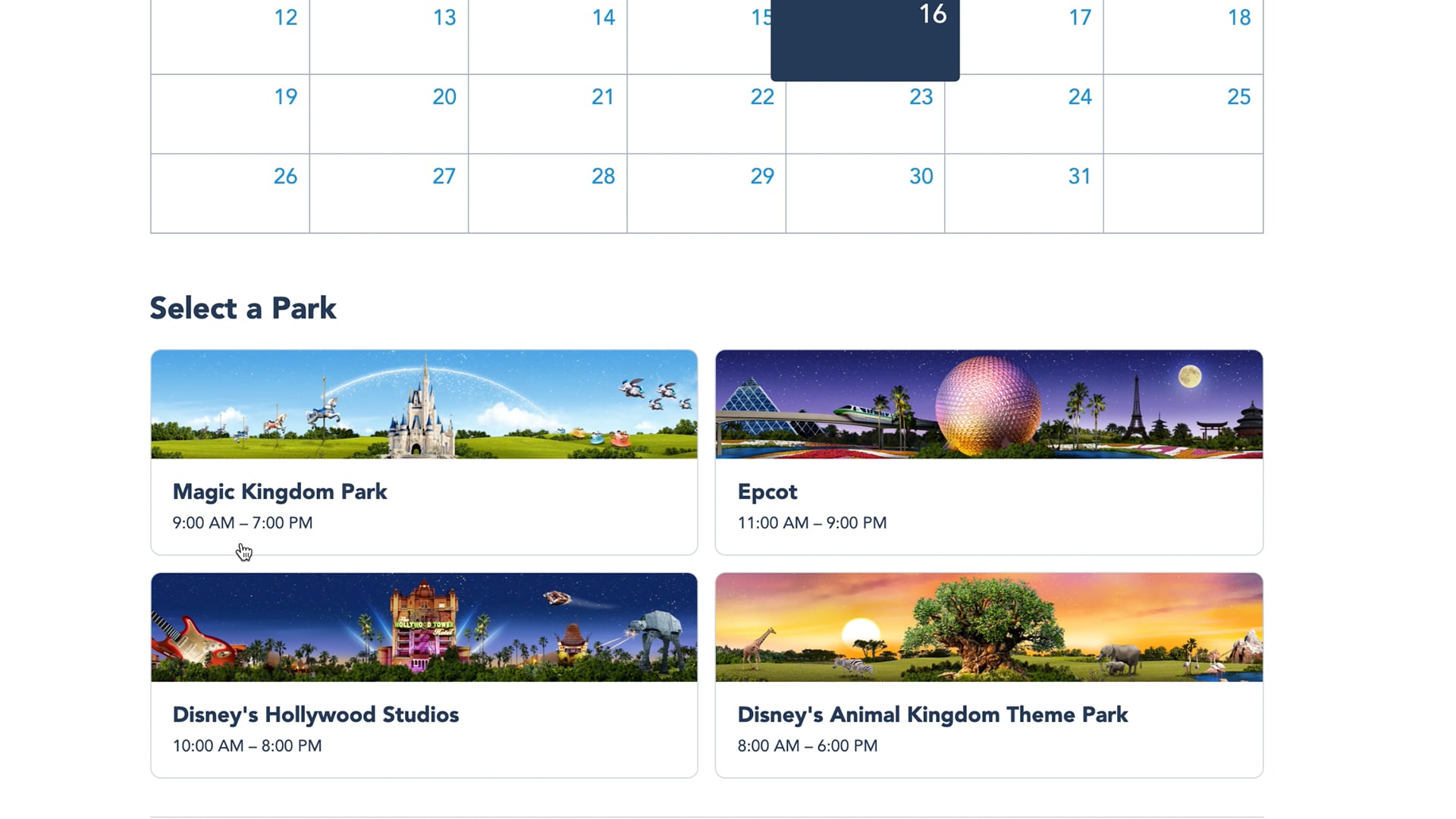 - Select Your Park Days. When you pick a day, scroll down and you should see all 4 parks and their hours. Once you click on one, you can go in and secure your reservation.
