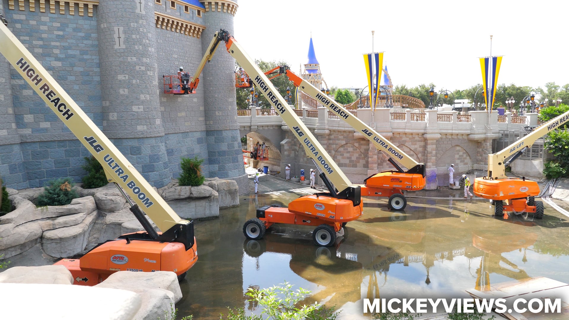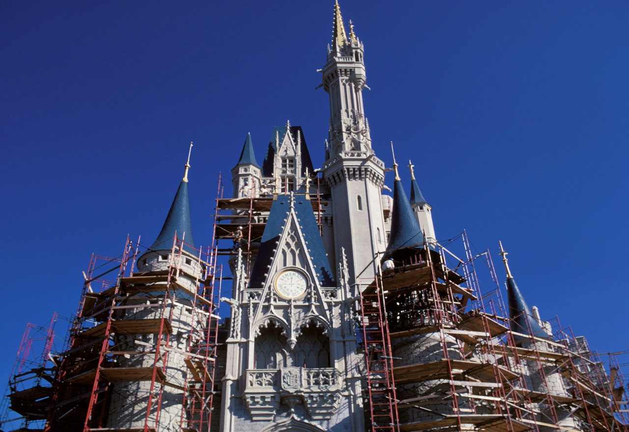 A repainting timeline has yet to be announced officially announced Disney. However, we will soon have some major clues. Mickey Views advises guests interested in catching the repainted castle on their trip to stay tuned for news on the draining of the moat around Cinderella Castle. This precursor to the repainting work will provide guests a good estimate on when the project will be complete.