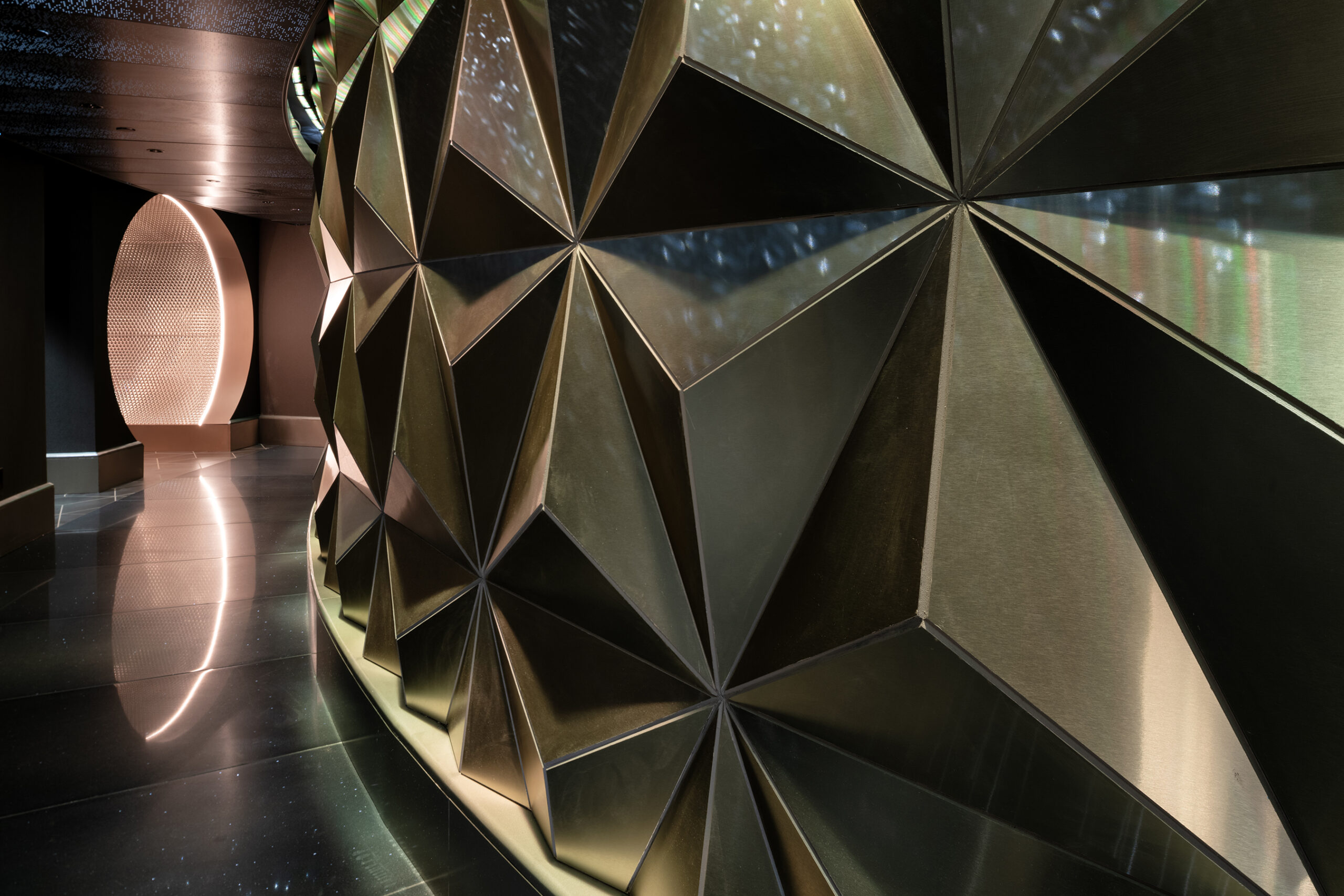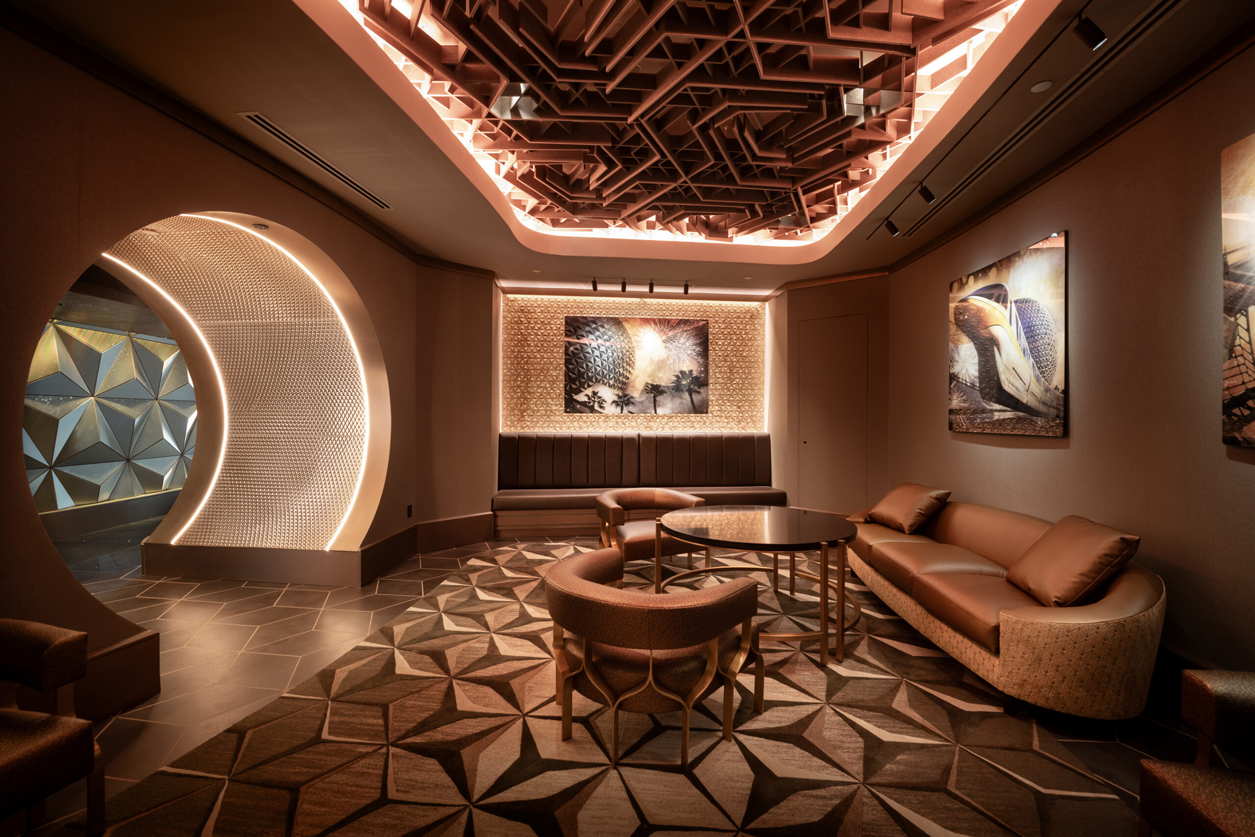 The GEO-82 waiting area features a modern, warm aesthetic complemented by tributes to Spaceship Earth’s iconic geodesic facade.