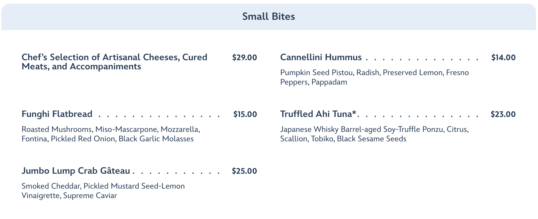 The menu for GEO-82, food wise, includes a selection of “Small Bites” as well as allergy-friendly alternatives.