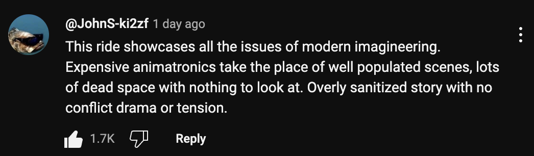 Many users on Disney’s official point-of-view video for “Tiana’s Bayou Adventure” comment on how the attraction encapsulates the shortfalls of modern Imagineering. Chiefly, the dedication of budget towards a dozen high-tech animatronics when 5 dozen medium-tech animatronics would have added more visual spectacle throughout the attraction. Several stretches of the ride’s interior previously inhabited by interesting, cartoonish animals are now populated solely by artificial plants.