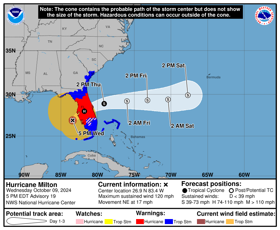 All of Central Florida is under a Hurricane Warning. Tornado Warnings in effect in some areas. Orlando-area airports suspended commercial flights Wednesday morning. Walt Disney World’s resort hotels are remaining partially-operational during the storm, protecting guests who have become stranded on-property. Walt Disney World is waiving cancellation fees and change fees for guests whose plans have been affected by the storm.